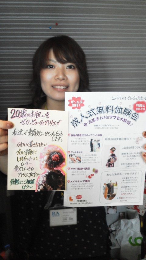 こんにちは\(^o^)/ ジョジョ店です☆ アトリエでは只今、成人式無料体験会を9月24日に予定しています。 振袖や袴の着付けやヘアセット体験 ジェルネイル体験 手作り髪飾り作り体験 ヘアやメイク講座 これから成人式を控えているお客様へ 新作振袖の展示 などなど中学生・高校生・パパ・ママ大歓迎です。 ぜひお気軽に遊びに来てください! 会場→マニパリ店ビル3階(和光メガネ隣) 9月24日土曜日 10時から5時まで ご来店の際は、ジョジョまでお問い合わせください! |